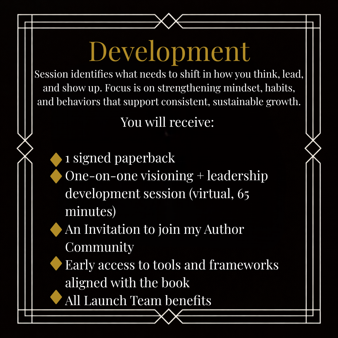 Development: Session identifies what needs to shift in how you think, lead, and show up. Focus is on strengthening mindset, habits, and behaviors that support consistent, sustainable growth.