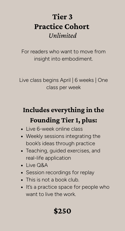 This experience is well-suited for groups who recognize that meaningful change doesn’t come from trying harder, but from learning how to work skillfully with how people are actually built. This tier also provides each member with a signed copy of the book, the 13-month guided meditation program, and the attunement one-pager.