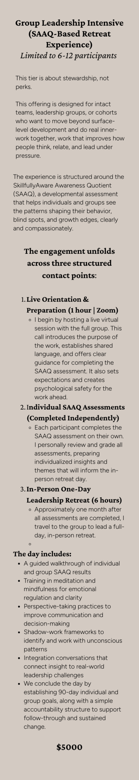 Tier 6: Group Leadership Intensive (SAAQ-Based Retreat Experience) – $5,000 | Limited to 6-12 participants