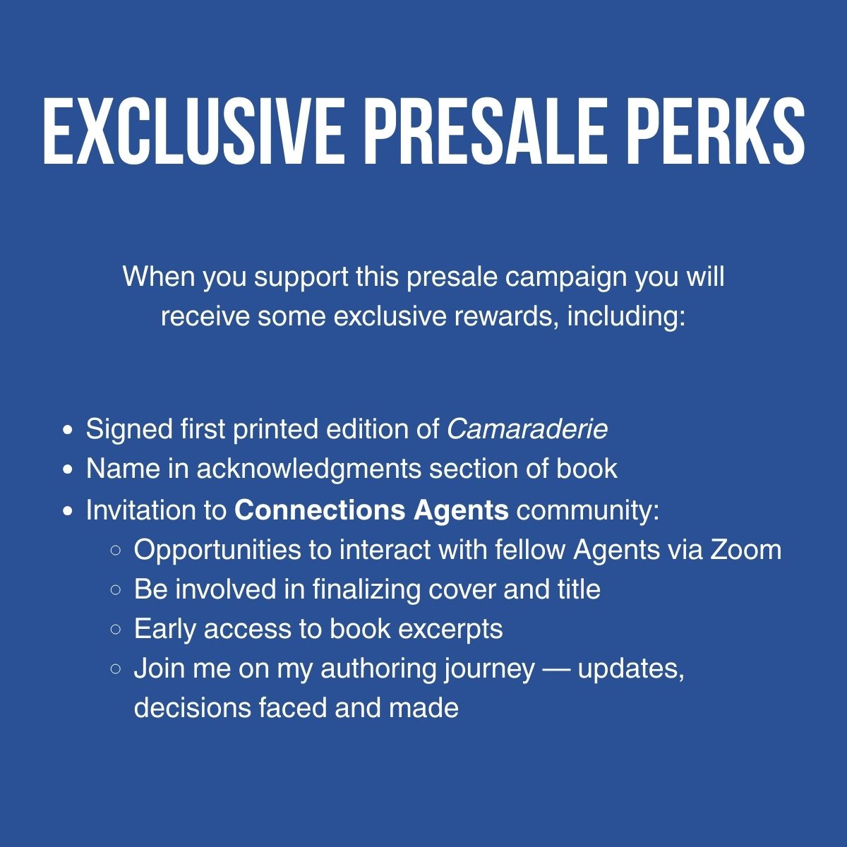 - Please share the pre-sale campaign on social media with your friends, family and network. Please use #CamaraderieBook and tag me as well as my publisher, Manuscripts Press, so we can help amplify your efforts.
