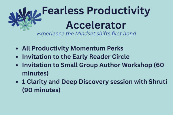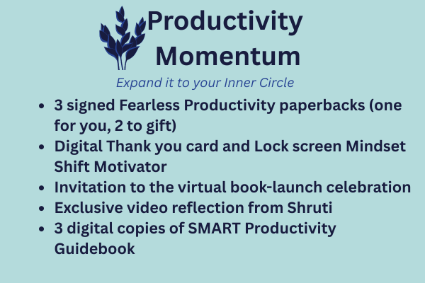 - Please share my presale campaign on Instagram (shrutirustagi.cl), Facebook, LinkedIn and X with your friends, family and network. Please use #FearlessProductivity and tag me so we can help amplify your efforts.