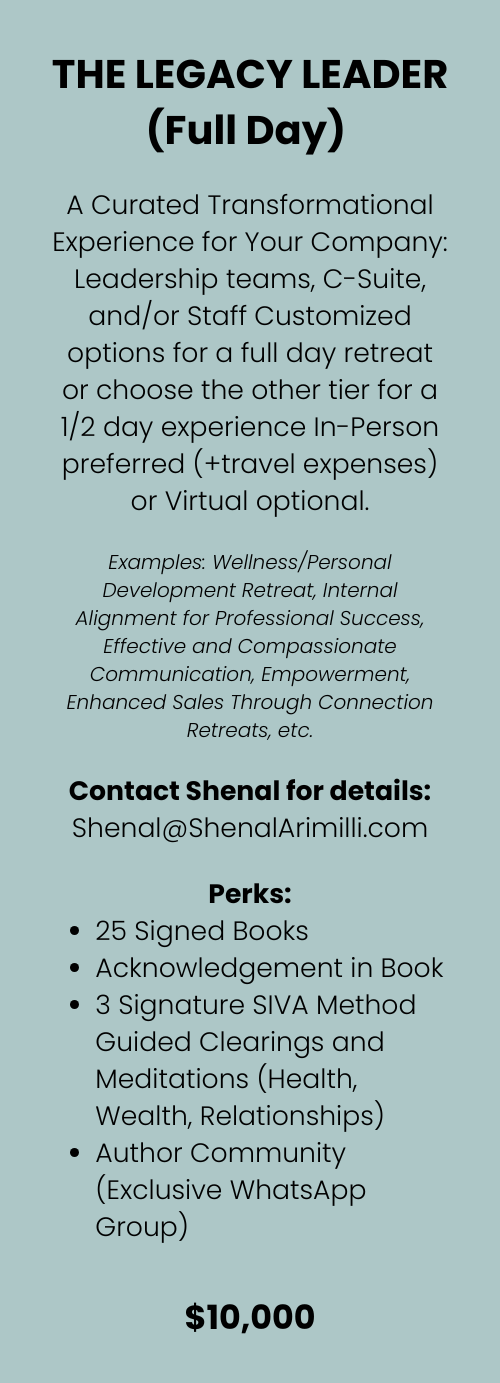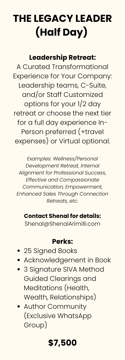 Leadership Retreat: A curated transformational experience for your company — leadership teams, C-Suite, and/or staff. Customized options for your half-day retreat. In-person preferred (+travel expenses) or virtual optional.