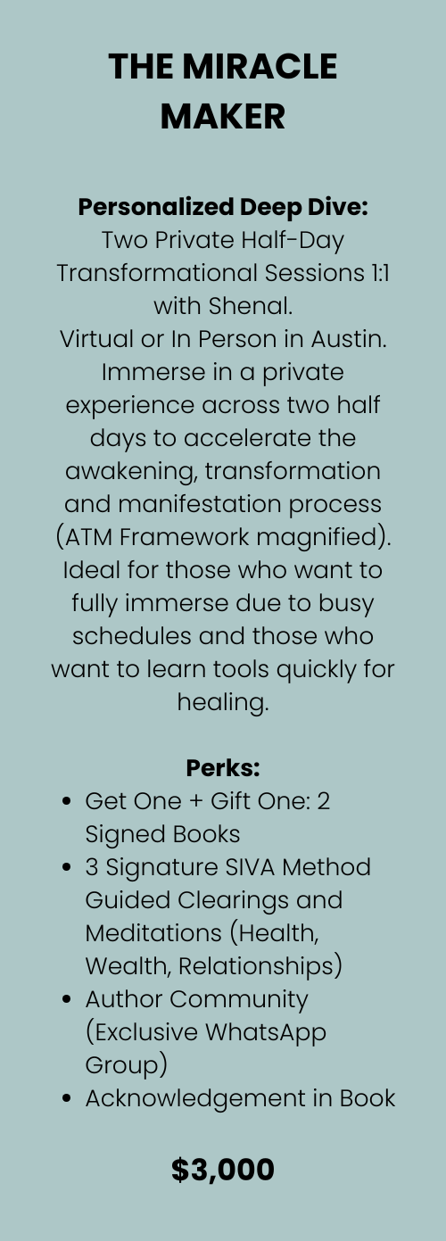 If you are ready for a concentrated, private immersion to accelerate your personal healing and development journey, The Miracle Maker is curated specifically for your evolution, growth, healing and alignment to your desired manifestation — with personalized intuitive focus, accelerated awareness to roadblocks and patterns holding you back, and access to the energetic shifts needed to create lasting change.