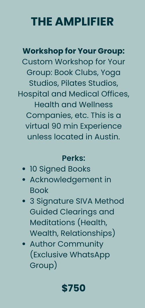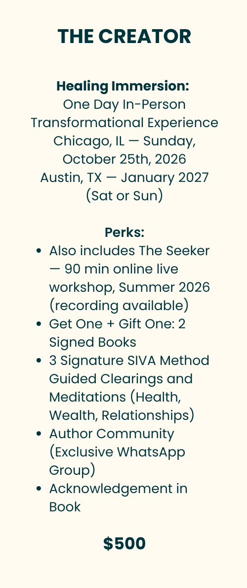 The SIVA Method is my signature guided meditation system — a deeply restorative practice designed to help you clear energetic blocks, reset the nervous system, and align with health, wealth, and relationships. All Founding Members receive three guided SIVA meditations as part of their package.