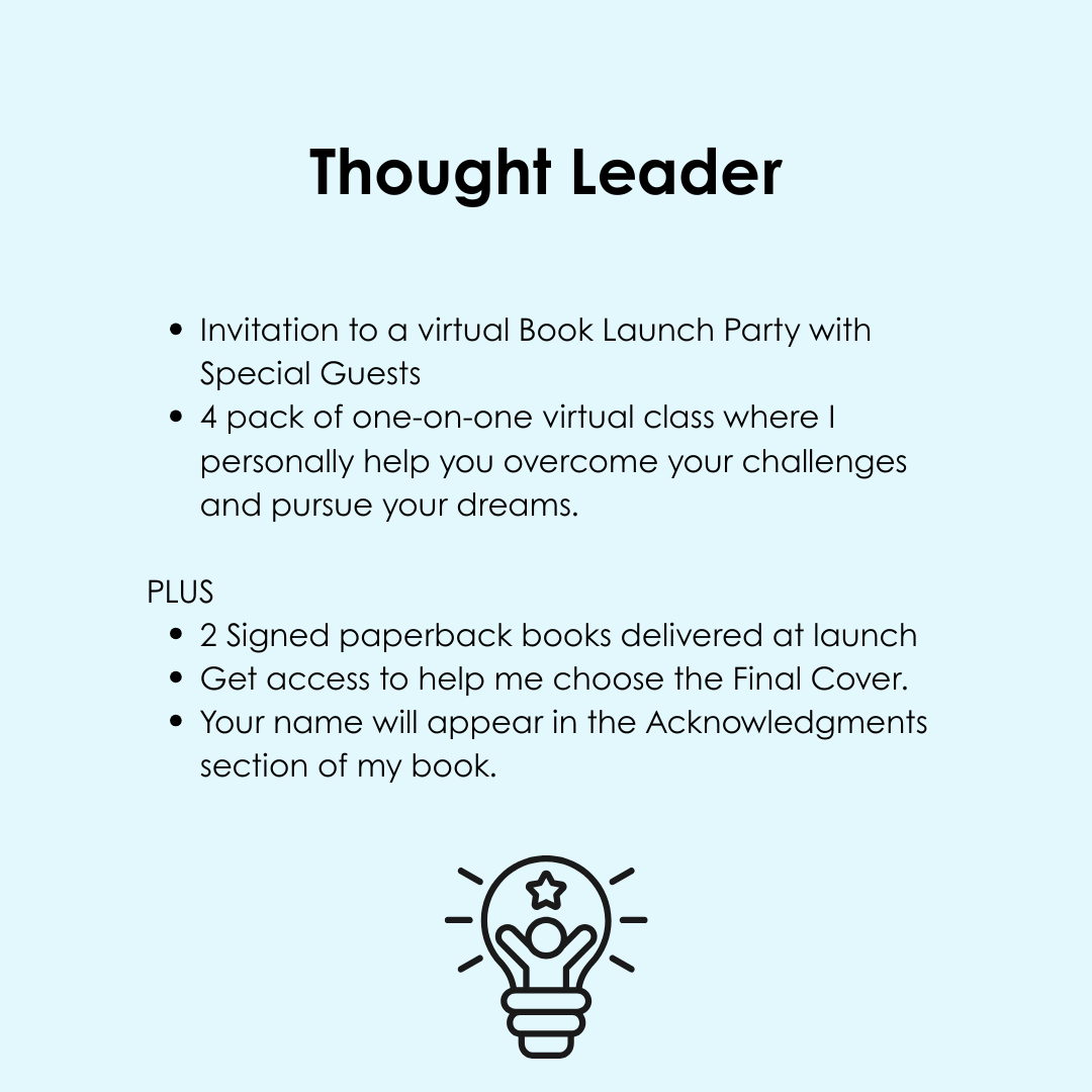 - The opportunity to have your name featured in the Acknowledgments section of my book (“with Special Thanks to”).