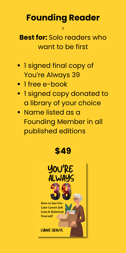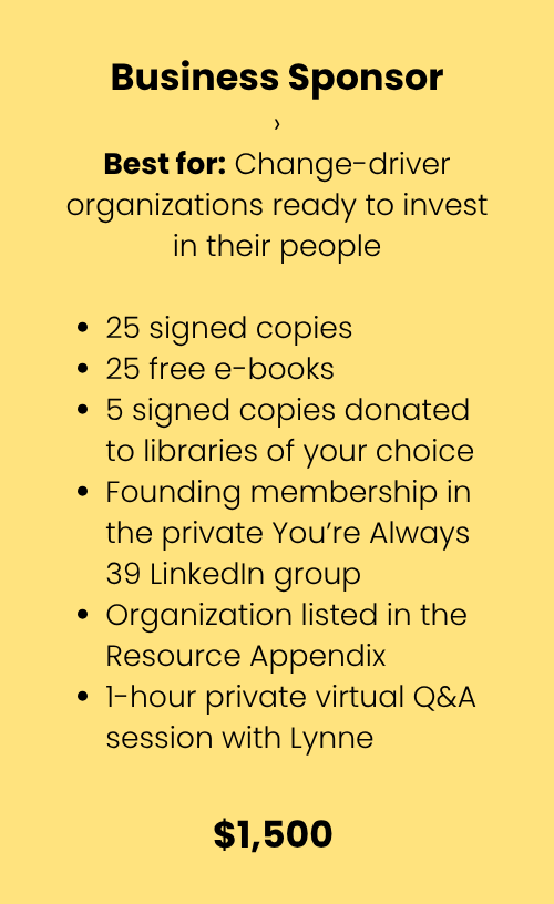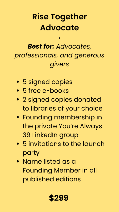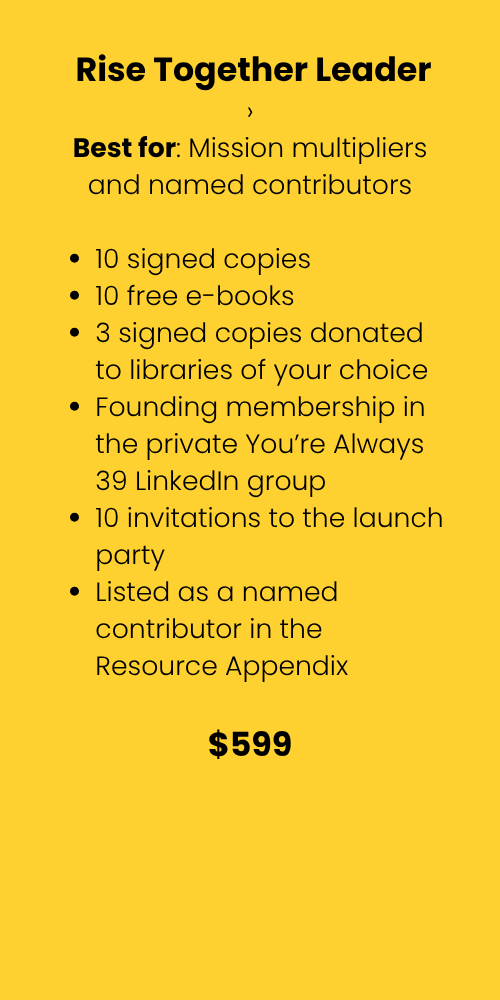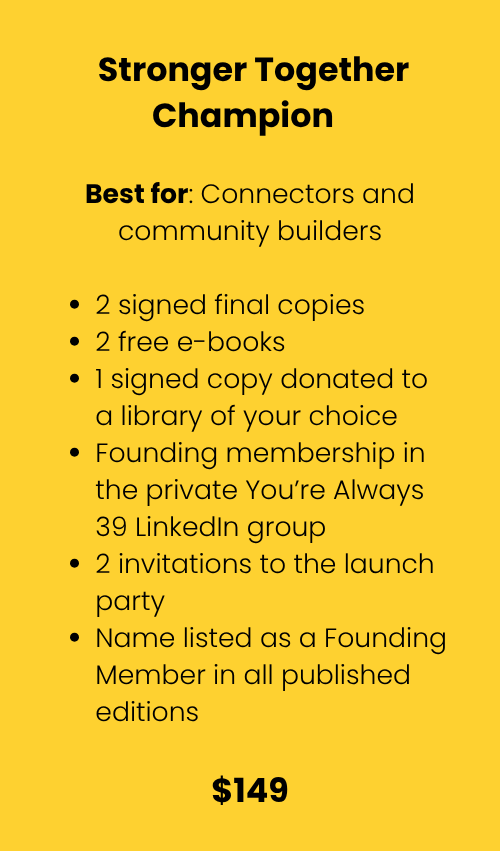 If you’re buying for yourself: start with “Founding Reader” ($49) for a signed copy, e-book, and a library donation in your name. Ready to join a private community of women committed to this mission? “Stronger Together Champion” ($149) adds founding membership in the private You’re Always 39 LinkedIn group — plus two launch party invitations.