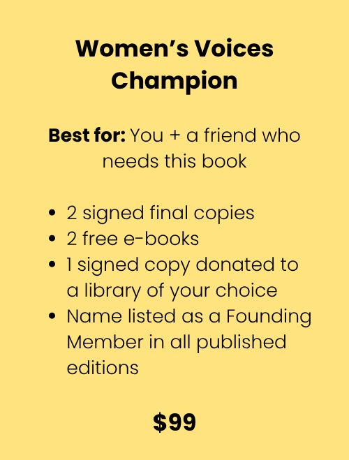 If you want to give: “Women’s Voices Champion” ($99) gives you two signed copies — one to keep and one to pass on — plus a library donation. Every tier includes at least one library donation, because access to this guide matters.